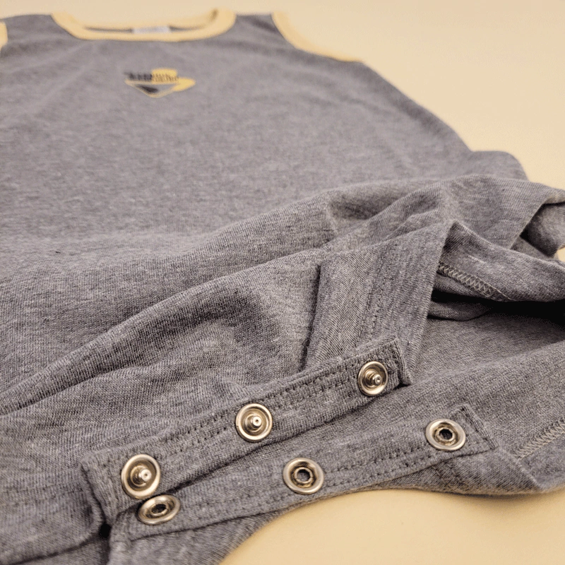 El enterito "Denham" está diseñado con broches de presión en la entrepierna, lo que facilita los cambios de pañal y hace que el vestir sea una tarea rápida y sin complicaciones.