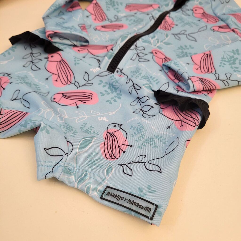 El diseño de mangas largas ofrece una cobertura adicional para proteger los brazos del sol, mientras que el cierre cuenta con una protección especial que evita el contacto con la piel, garantizando mayor comodidad. Este enterito está disponible en diferentes estampas súper lindas y divertidas. Los delicados voladitos añaden un toque especial, brindando un detalle hermoso y único.