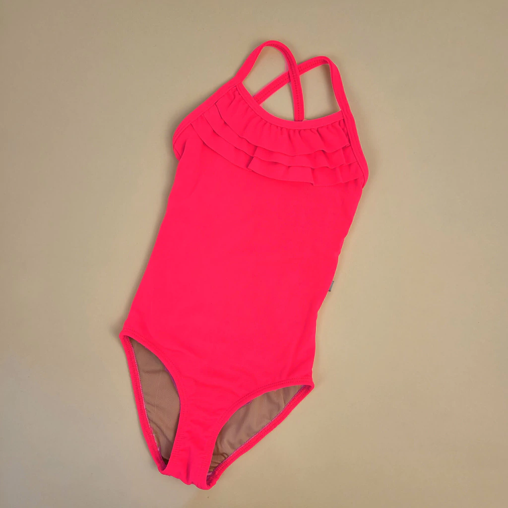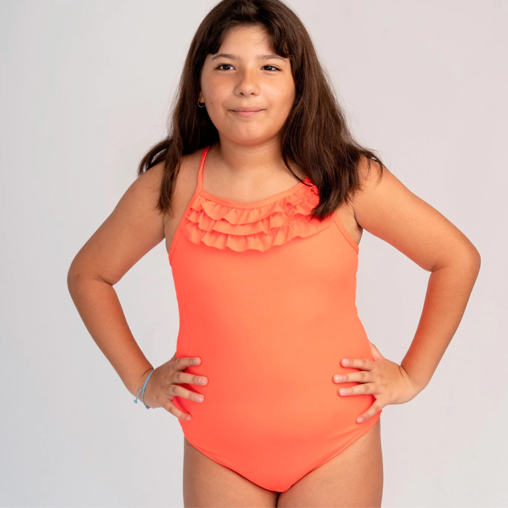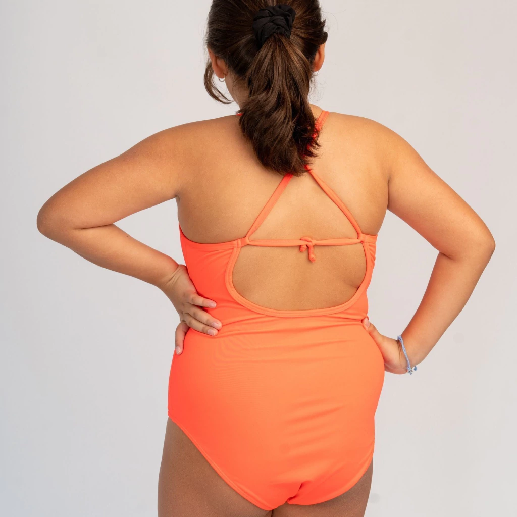 La malla lisa entera “Tabasco” es de tricot anticloro y con FPS +50.