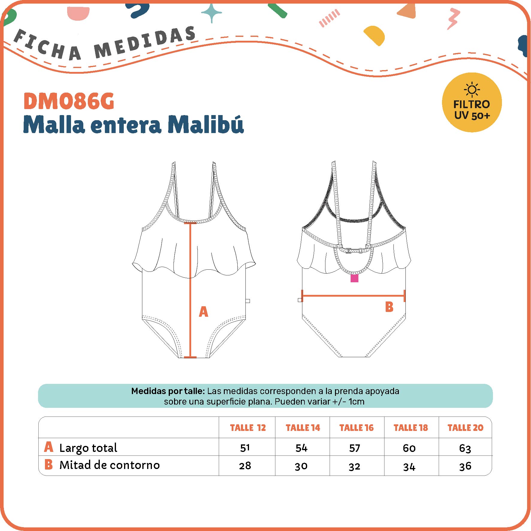 La malla entera "Malibú" es perfecta para que las más chicas disfruten del agua con comodidad y seguridad. Diseñada para niñas y preadolescentes, cuenta con un volado en la parte superior y tiritas regulables que aseguran un calce cómodo y adaptable.